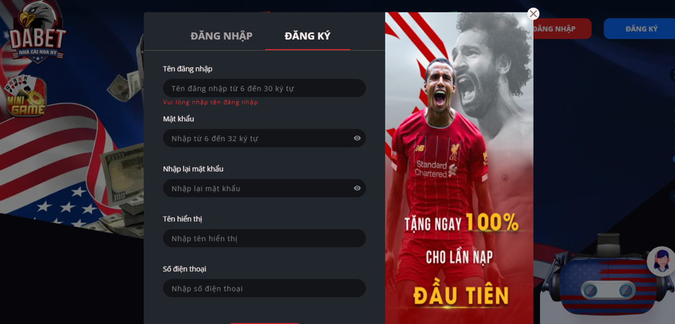 Giao diện Đăng Ký tài khoản tại Dabet.