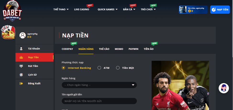 Giao diện nạp tiền sau khi đăng ký thành công tài khoản Dabet.