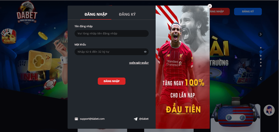 Nên đăng nhập lại bằng một trình duyệt khác trình duyệt mình đang dùng hoặc sử dụng điện thoại. Truy cập đường link Dabet an toàn, sau đó, click vào mục Đăng Nhập. Nhập lại tên và mật khẩu, bấm “Đăng Nhập” là hoàn thành.