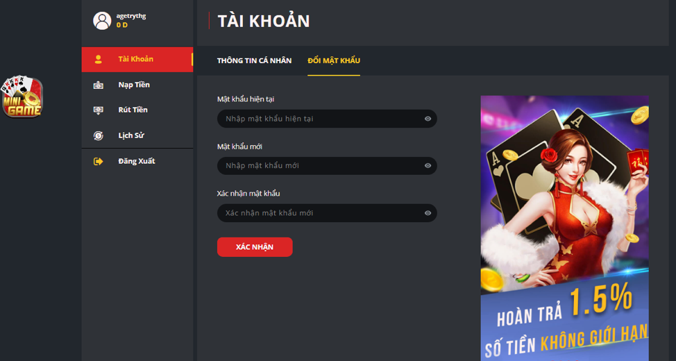Việc đổi mật khẩu có thể thực hiện tại danh mục “Tài khoản” của nhà cái Dabet. Các bác chỉ việc nhập mật khẩu hiện tại, mật khẩu mới, sau đó bấm Xác nhận là được. Như vậy lần sau anh em chỉ việc đăng nhập bằng password mới mà thôi.